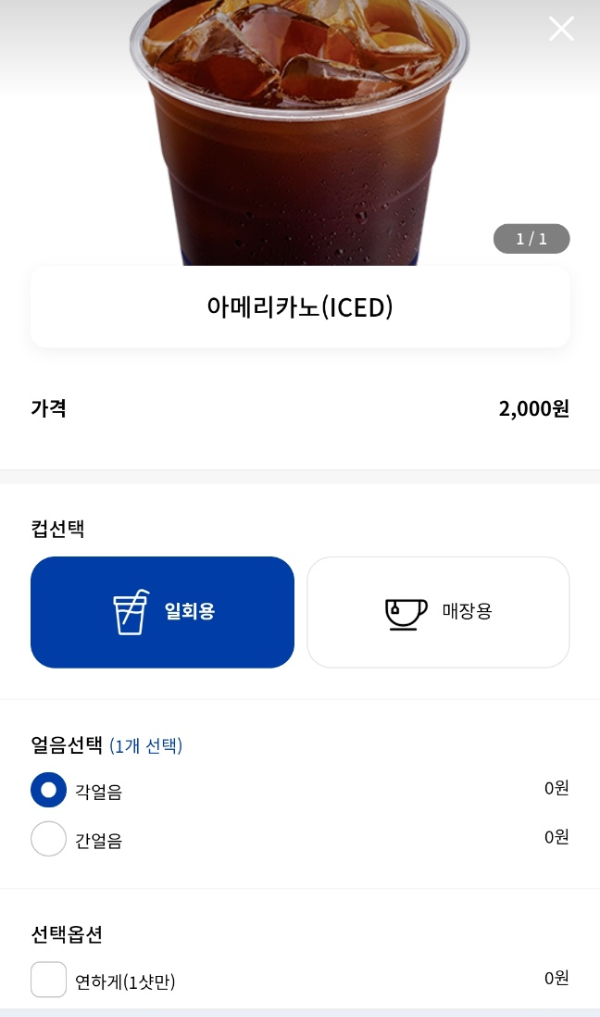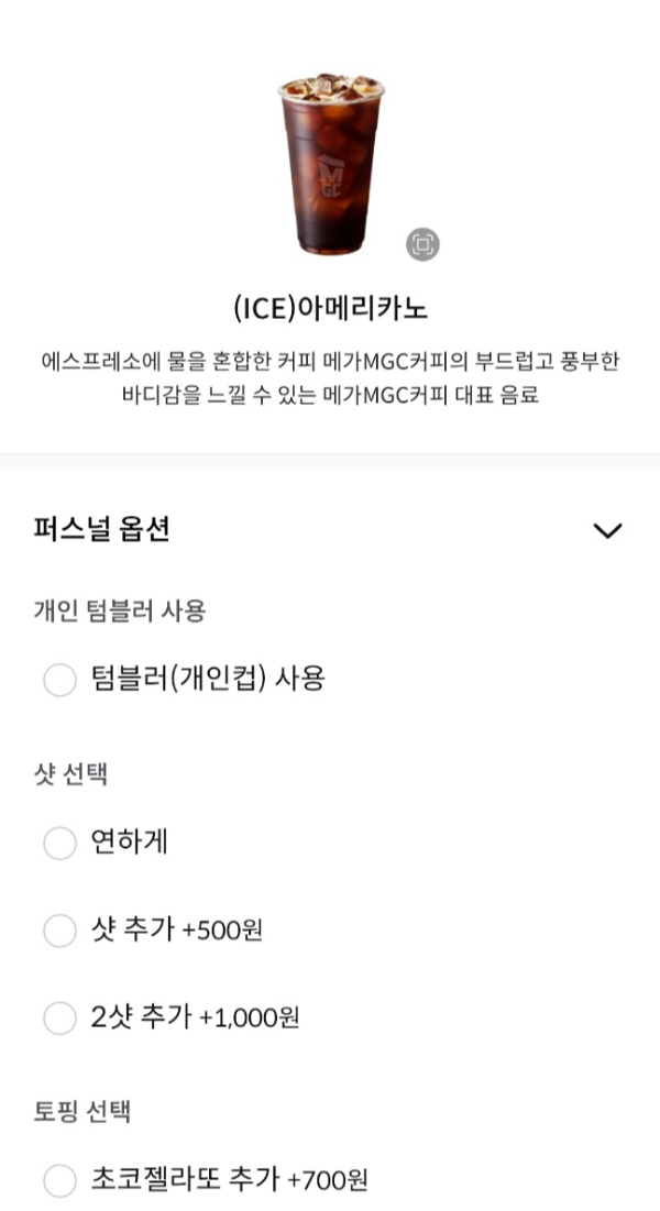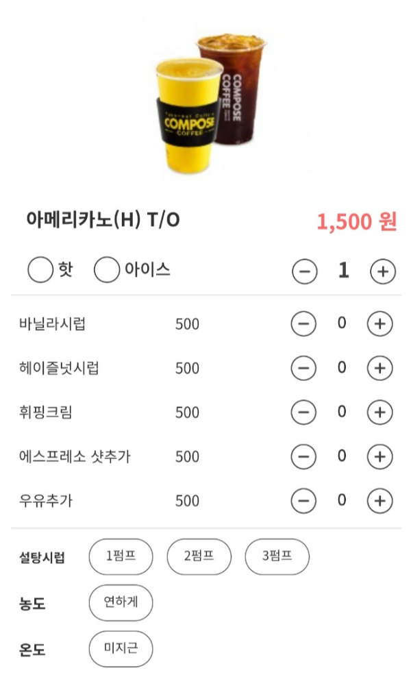 추가로, 아메리카노 주문 시 옵션으로 바닐라시럽, 헤이즐넛시럽, 휘핑크림 등을 선택할 수 있고, 샷추가 우유추가도 가능합니다. 옵션별로 추가금액은 500원이에요.