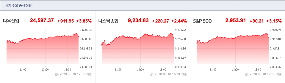 그래서 미국 주식시장은 빨갛게 물들었습니다. 다우, 나스닥, S&P500지수가 2.4~3.8%이상 치솟고 미국의 대표 항공회사인 델타항공하고 유나이티드 항공의 주가도 펄쩍 뛰었다고 합니다. 김칫국인지 몰라도 곧 하늘길도 활짝 열릴 것이란 기대감이겠죠?