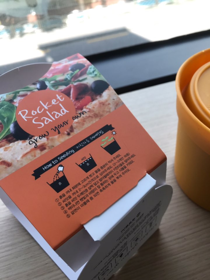 드디어 루꼴라 키우기 키트가 도착했습니다. 노란 플라스틱 화분안에 흙과 씨앗이 담겨 있어요. 활용방법을 꼼꼼히 읽어보고 씨앗심기 준비를 합니다.(두근두근..!)
