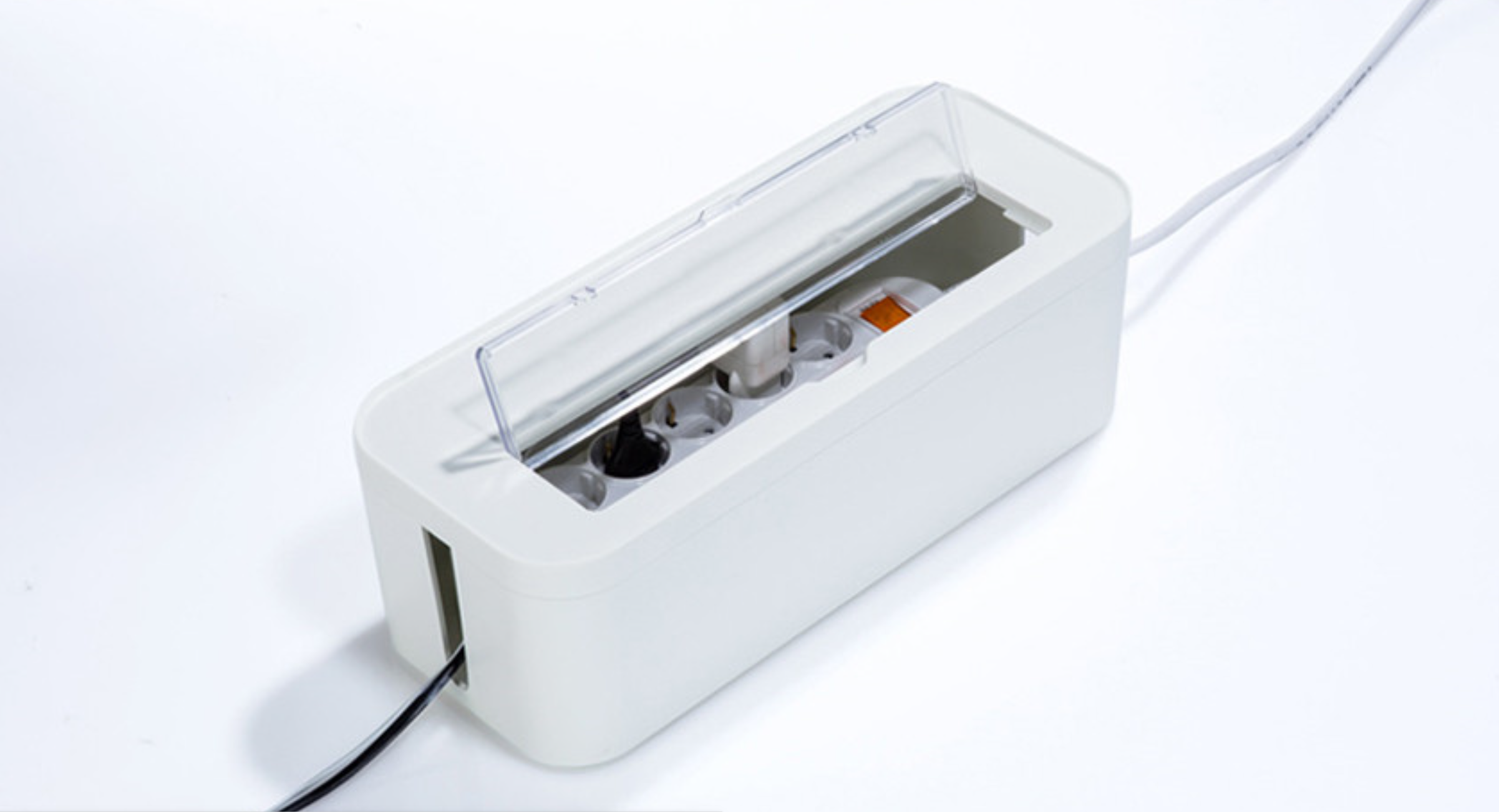 대부분 긴 플라스틱 박스 형태로, 멀티탭을 집어넣고 양옆의 구멍을 통해 플러그 선을 정리하는 간단한 구성이에요.