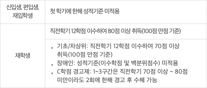 * 재학생은 1차신청을 하도록 해야합니다(단, 재학 중 2회에 한해 2차신청 가능하고, 구제싱청서 제출시 재심사가 가능합니다 : 학교에 따라 반드시 1차신청하도록 되어 있습니다.) - 심사기준 / 성적기준