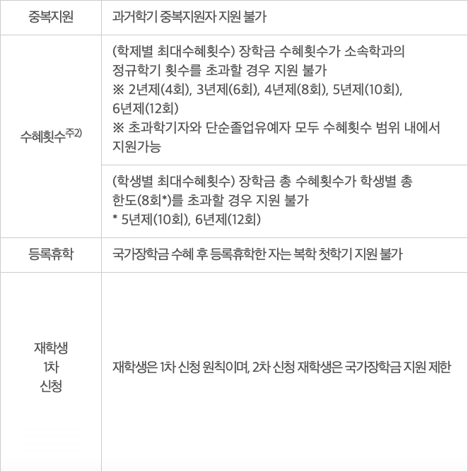 * 편입 등으로 학교가 변경되어도 장학금 총 수혜횟수는 누적관리 됩니다.(타 대학 및 동일 대학 신, 편입, 재입학 모두 포함)