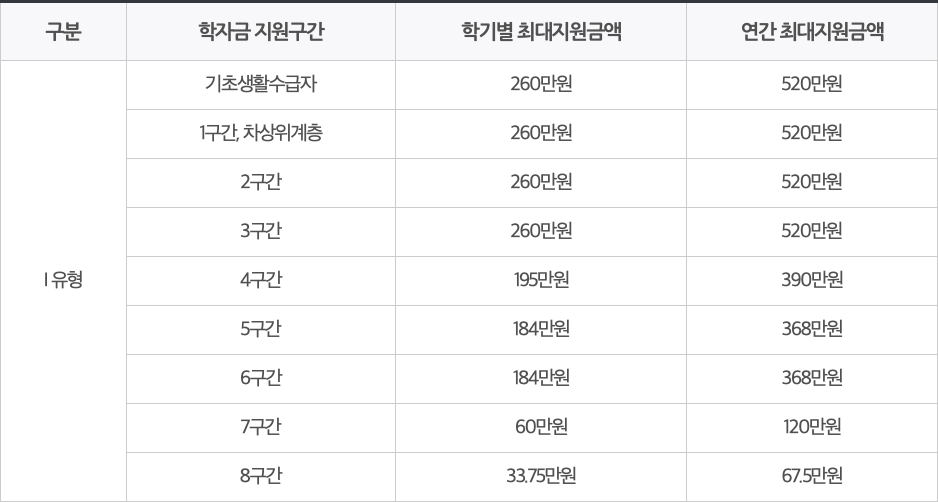 선정기준 닫기 < Ⅰ유형 > 1) 지원대상 - 대한민국 국적을 소지하고, 국내대학 재학 중인 학자금지원 8구간 이하 대학생 ※ 단, 대학구조개혁평가 결과 E등급 대학의 신·편입생은