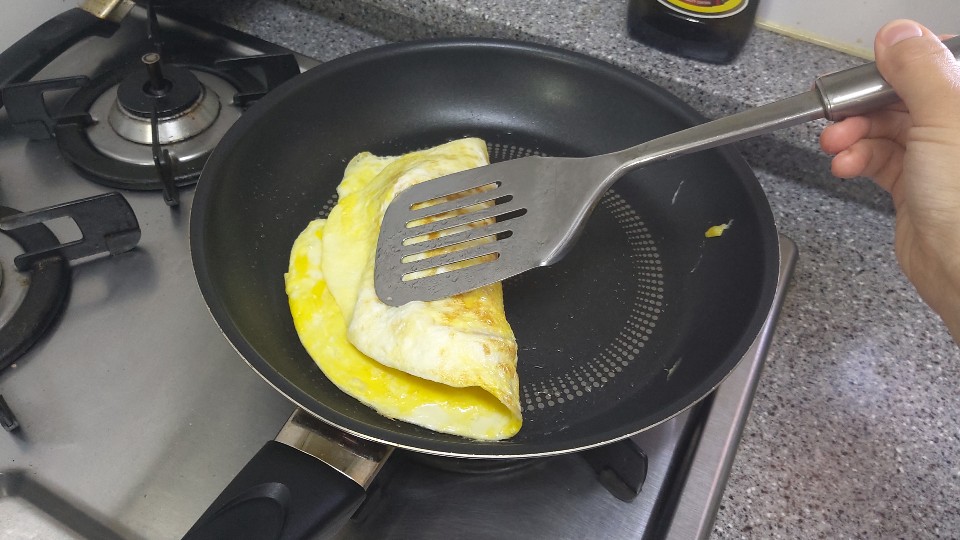 4. 중요 재빨리 둥글게 퍼진 계란을 뒤집개로 살살 접어 네모난 식빵 모양으로 접어(?)줍니다. 그러나..