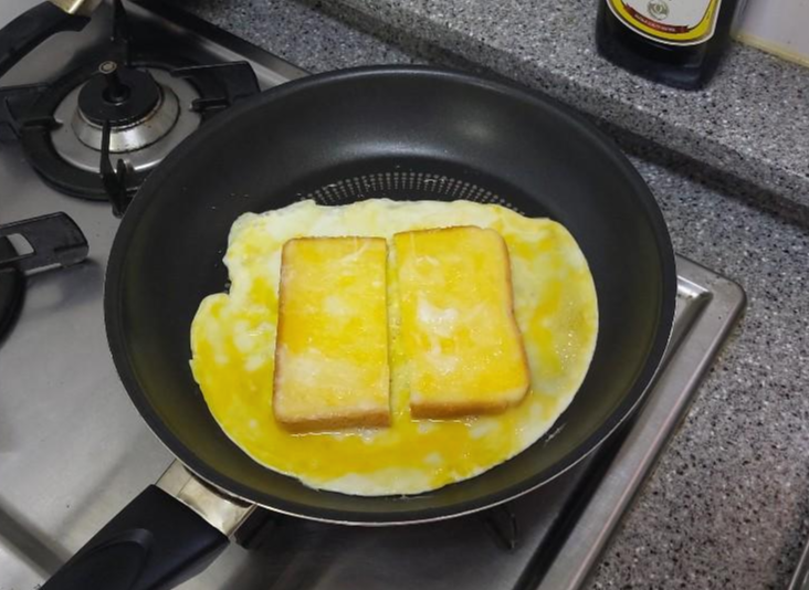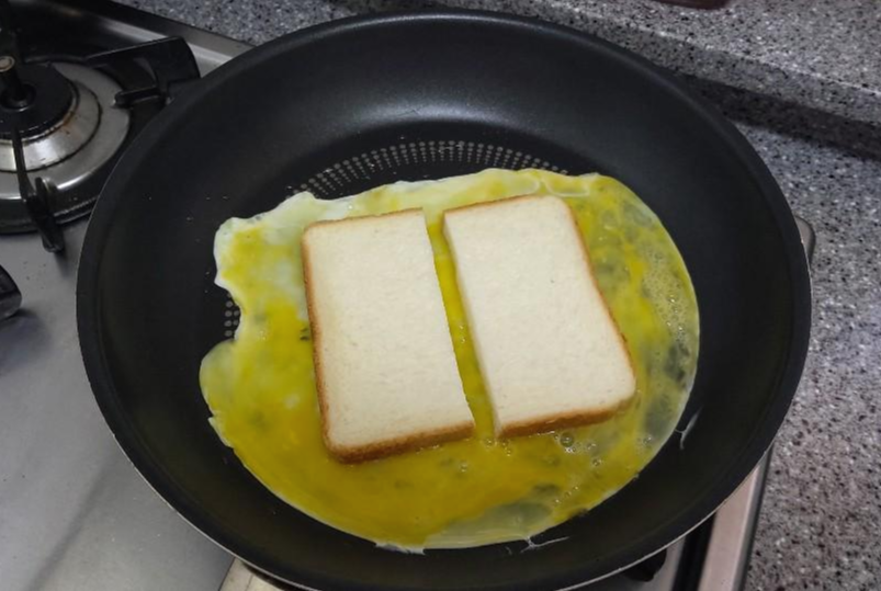 2. 계란이 익기 전에 잘라놓은 식빵을 올렸다가 뒤집어줍니다. (그럼 식빵 양면에 계란물이 묻겠죠?)