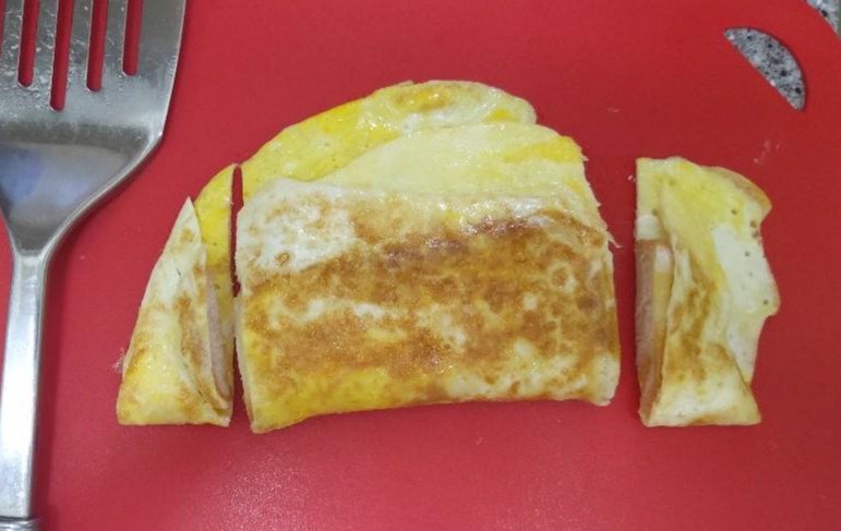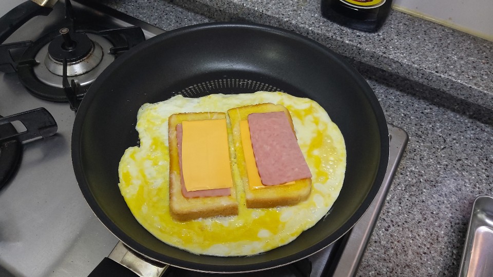 여기서 참사(?)가 벌어집니다. 원팬토스트 재료준비로 계란을 미리 풀어줄 때 우유를 넣으면 더 좋았겠다고 생각한 이유가 이건데요, 식빵 뒤집고 햄, 치즈 올리고 '맛있겠지?' 생각하는 사이에 계란이 벌써 빳빳하게 익어서 네모 모양으로 접히지가 않았어요. ㅎㅎㅎ그래서 네모 모양이 아니라 반달(..) 모양이 돼버렸어요.