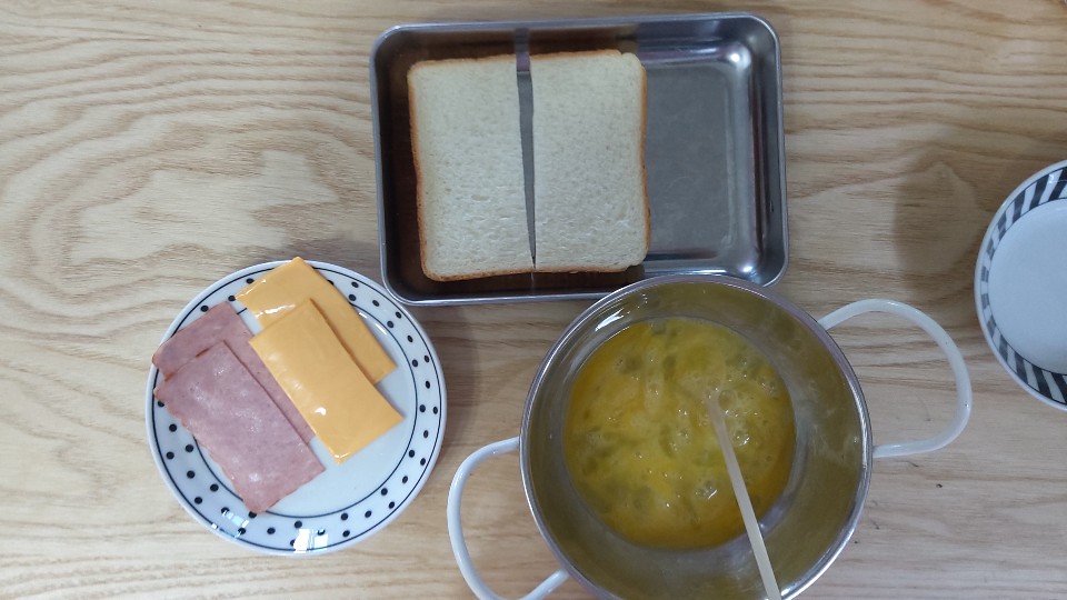 준비물: 식빵 1장, 계란 2개, 치즈 1장, 슬라이스햄 1장(+식용유 약간)