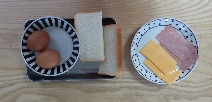 준비물: 식빵 1장, 계란 2개, 치즈 1장, 슬라이스햄 1장(+식용유 약간)