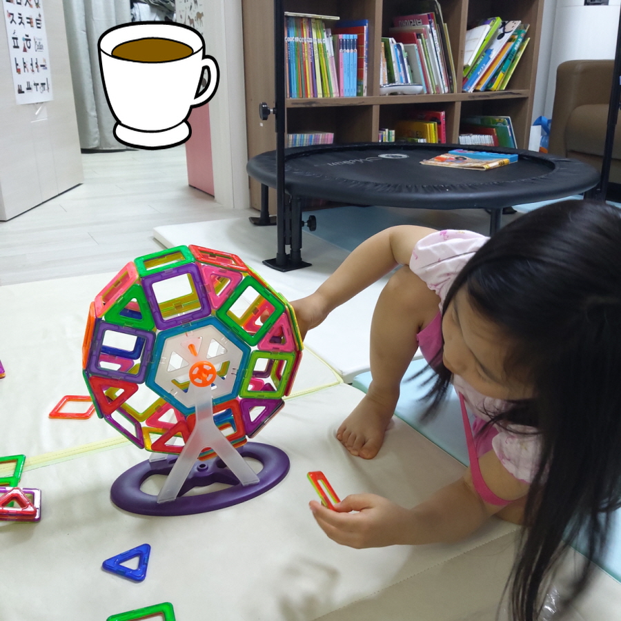 "이게 대관람차라는 건데, 진짜 대관람차는 어떻게 생긴 걸까?" 하며 유튜브에서 짧은 대관람차 영상을 찾아 보여주기도 했습니다. 이 다음에는 어디 놀이공원에 데려가 실제 대관람차를 함께 타볼 수도 있겠죠. 이렇게 놀이를 통해 새로운 흥미거리와 호기심을 연결해주면 더 좋은 것 같아요.