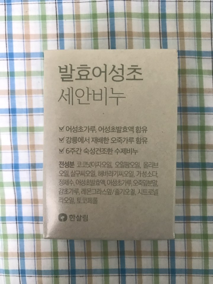 세안할때 사용하는 한살림 발효어성초 세안비누에요~요제품은 천연재료 (코코넛야자오일,오일팜오일,올리브오일,살구씨오일,해바라기씨오일,가성소다,정제수,어성초발효액,어성초분말,오죽잎분말,감초가루,레몬그라스잎/줄기오일,시트로넬라오일,비타민E)를 사용하여 만들어져서 굉장히 순해요.