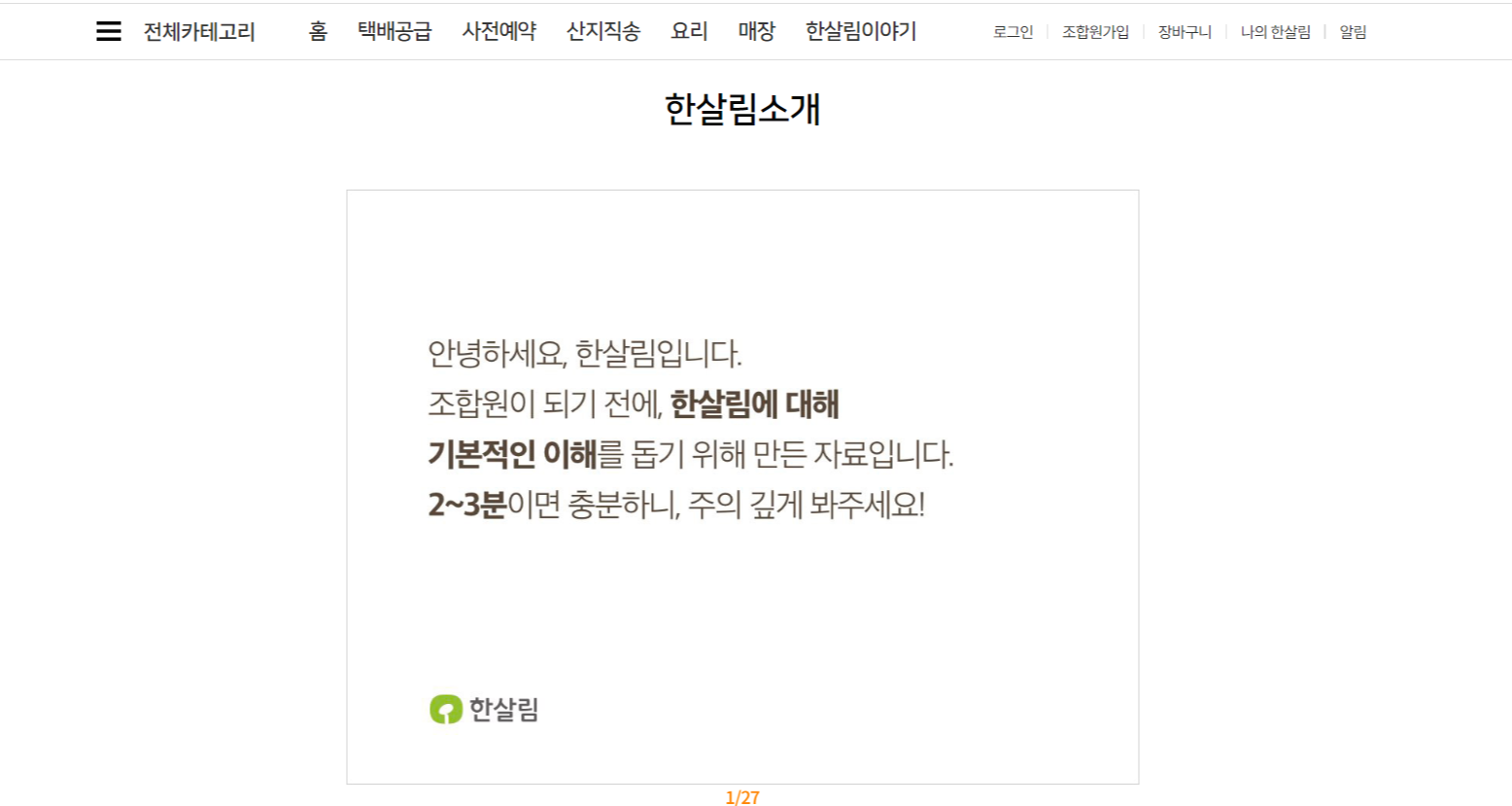 | 한살림이란? 한살림은 먹거리에 대한 믿음을 바탕으로생산자와 소비자가 중심이되어 운영되고 있는 조직이에요. 조합원들은 한살림에서 공급되는 물품을 이용함으로써 먹을거리의 소중함을 알아갈 수 있고, 생산자 또한 이런 조합원들의 믿음으로 항상 안전한 먹거리를 제공하고 있어요. |