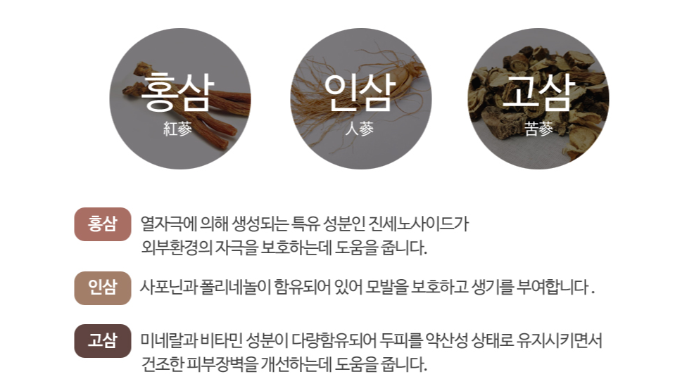 요제품 또한 저자극, 천연유래 세정성분의 샴푸로 건강하게 사용하실 수 있어요. 홍삼,인삼,고삼 추출물도 함유하고 있어 모발을 보호하고, 두피를 약산성 상태로 유지시켜 건조함을 개선해 준다고 하네요.