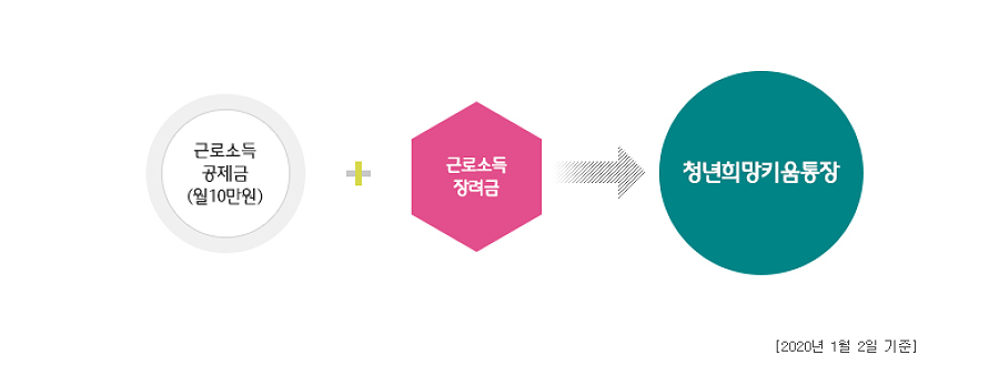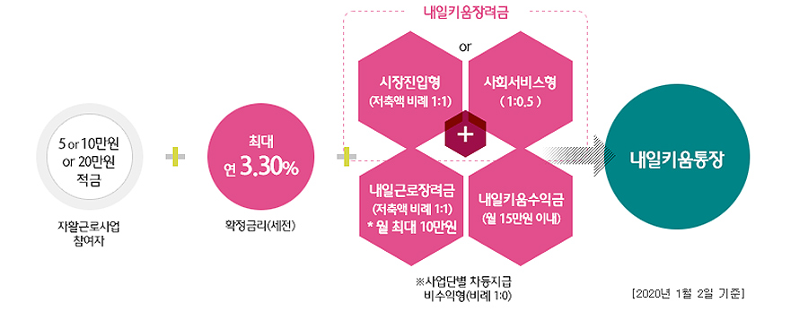- 내일근로장려금 : 본인 저축액의 1:1(단 20만원 저축시 10만원 매칭)