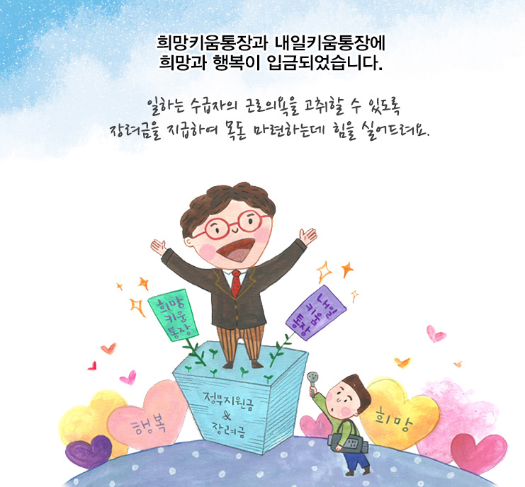 희망키움통장, 청년희망키움통장, 내일키움통장을 들어보셨는지요? 자격조건만 된다면 가장 빠르게 목돈을 마련할 수 있는 방법이 이들 희망키움통장들인데요. 국가에서는 일을 통해 생계수급 가구의 자립을 돕기위해 목돈을 마련할 수 있는 여러가지 복지지원 정책을 펼치고 있죠. 그중에서 이번에 알아볼 것은 희망내일통장사업에 포함되는 청년저축계좌, 청년희망키움통장, 희망키움통장 I, 희망키움통장 II 그리고 내일키움통장 신청 자격조건입니다. 우선 청년희망키움통장, 희망키움통장을 위주로 살펴보고 청년저축계좌와 내일키움통장도 함께 알아볼게요.