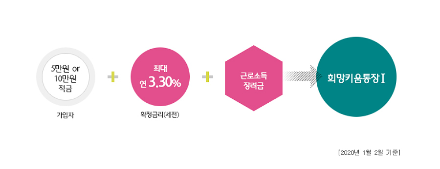 - 희망키움통장 I 대상 : 신청 당시 가구 전체의 총 근로, 사업소득이 기준 중위소득 40%의 60% 이상인 일하는 생계, 의료급여 수급 가구와 기타 차상위 계층 가구가 가입할 수 있습니다.