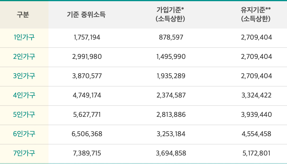 * 가입기준, 유지기준 소득 상한을 초과하면 가입할 수 없거나 해지사유가 됩니다.
