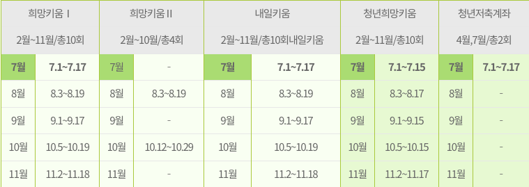 * 2020년 희망키움, 내일키움, 청년희망키움, 청년저축계좌 신청접수가 7월 1일부터 17일까지 진행됩니다. 이중 청년저축계좌는 올해 마지막 접수라고 하니 참고해주세요. 청년저축계좌는 4월, 7월 2회모집이고 나머지는 2월부터 10월 또는 11월까지 분할 모집합니다.