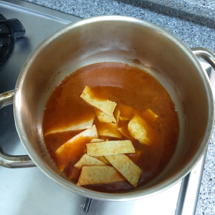 저는 끓는 물에 고추장, 고춧가루, 설탕..등 각각의 양념을 따로 넣지 않고, 별도의 그릇에 양념을 다 섞고 약간의 시간을 둔 후 사용을 해요. 그럼 좀 더 어우러진(?) 맛이 나고 양념이 숙성되어서인지 풍미가 좋아지더라고요.