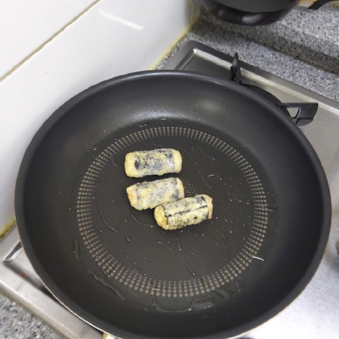 저는 김말이를 좋아해서 냉동식품을 사놓았는데요. 에어프라이어에 돌리는 게 가장 간편한데 얼마 전 고장이 나서 ㅠㅠ 이번엔 후라이팬에 구웠어요. 냉동 상태로 바로 구우면 타거나, 식용유를 너무 많이 먹거나, 속까지 고루 익히기 어려울 수 있는데요, 전자렌지에 미리 해동을 한 후 기름 살짝 둘러 굽는 걸 추천합니다.