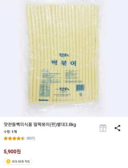 요즘은 동네 마트에서도 밀떡을 팔긴 하는데요, 옛날 학교 앞 분식집에서 먹던 그 밀떡맛을 느끼려면 온라인쇼핑몰에서 파는 이런 밀떡을 사서 쓰는 게 좋더라고요. 무려 3.8kg에 대략 6천원(+배송료 2,500원 추가^^) 밖에 안 하는 저렴한 가격도 좋고요. (*저는 이런 밀떡을 사다 소분해놓고 닭볶음탕이나 부대찌개 같은 음식을 할 때도 넣어서 먹어요. 꿀맛!)