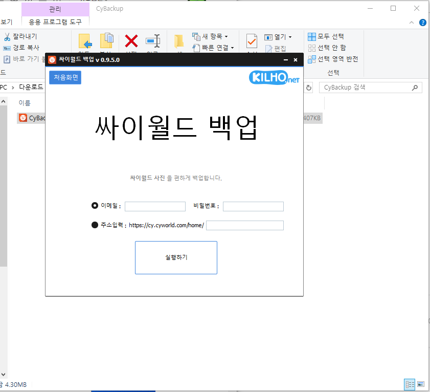 프로그램이 실행되면, 3) 아래와 같은 팝업창이 뜨게 되는데, 이제 기억해 두었던 이메일주소(아이디)와 비번을 넣거나 혹은 미니홈피 주소를 직접 입력하여 '실행하기' 버튼을 누르면 자동으로 싸이월드 내 사진들이 백업되기 시작합니다.