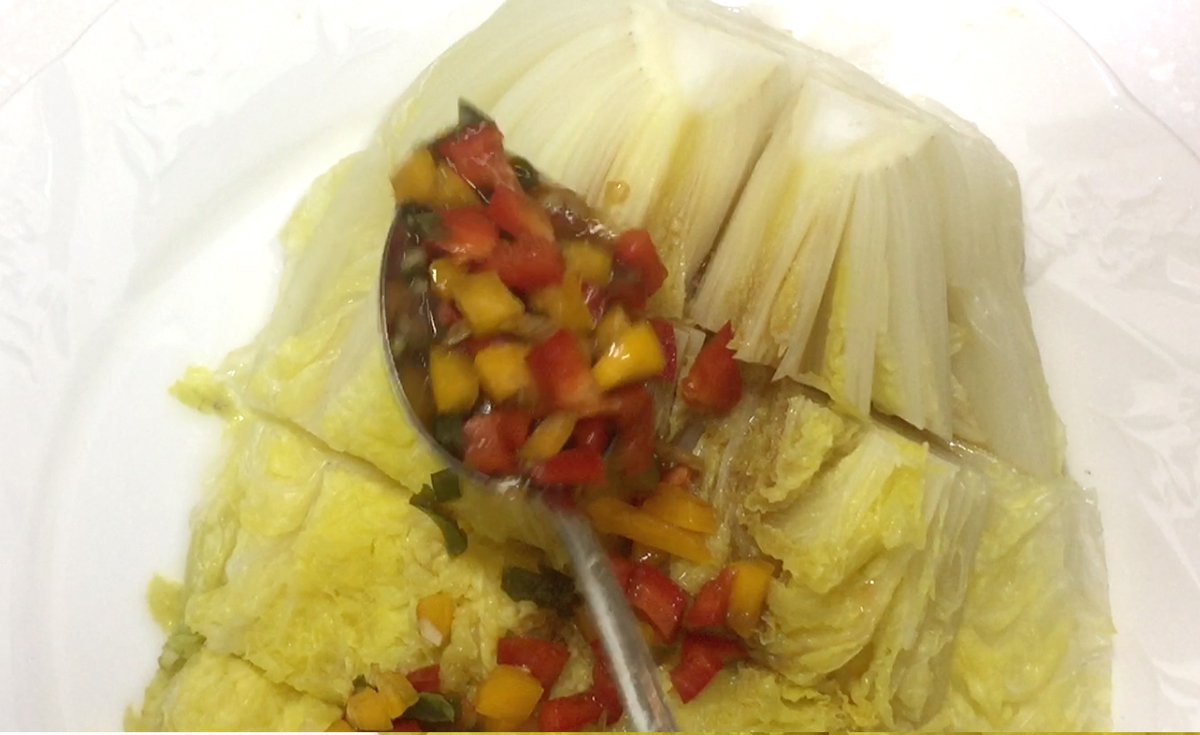 배추 위에 양념을 듬뿍 뿌려주면 완성! 식초가 들어가 있는 음식은 여름에 피로 회복에 도움이 된대요. 그리고 저는 개인적으로도 부담스럽지 않은 맛이라 배추찜을 좋아하는 편이에요. 새콤달콤함도 좋구요. 맛이 뭐랄까 갓만든 피클 같기도 하고 백김치 같기도 한데 그렇다고 피클이나 백김치 맛하곤 완전 달라요. 그리고 조금 넣은 청양고추가 더 입맛을 돋궈주는 것 같습니다.