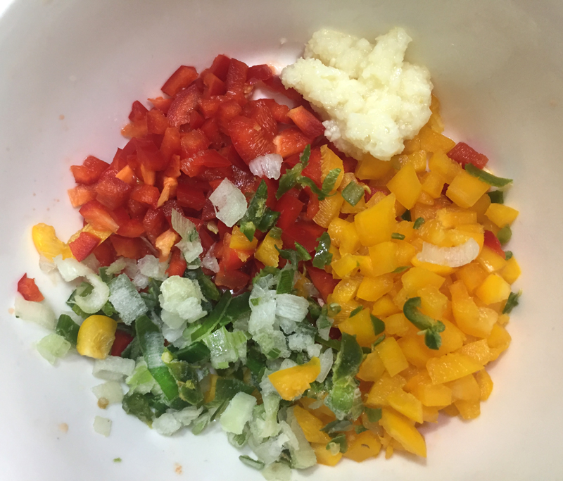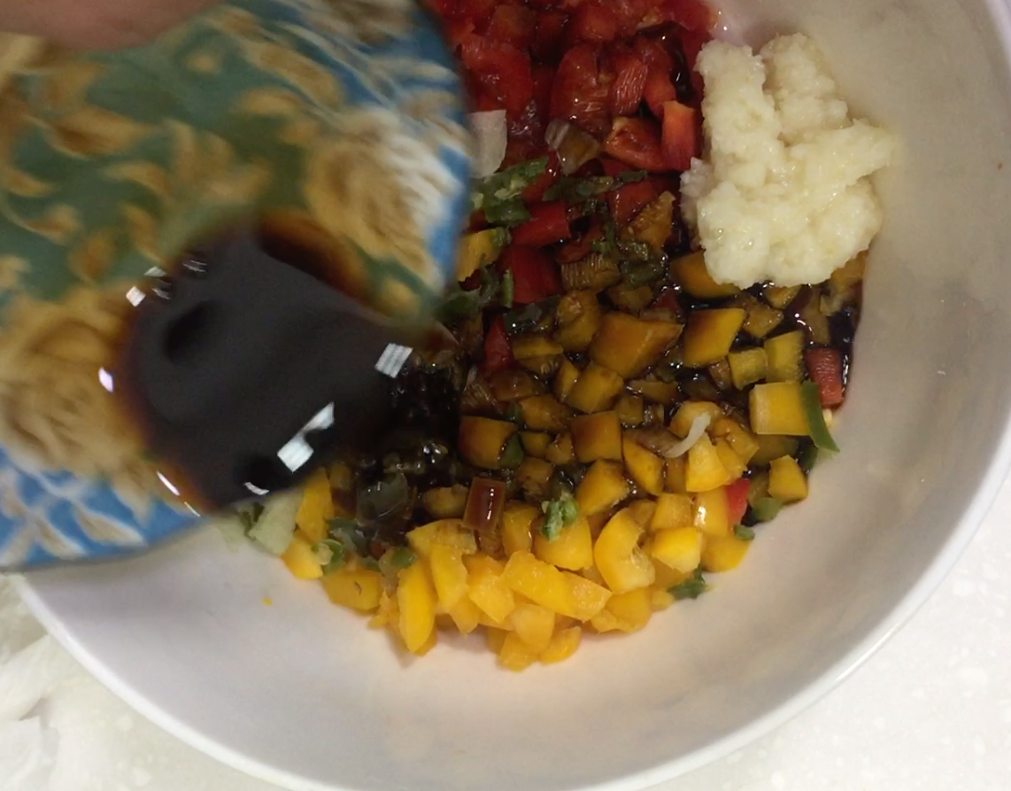 배추를 찌기전에 배추찜 양념소스를 만들어요. 파프리카도 양념에 같이 넣는 건데요. 파프리카, 대파는 잘게 썰고, 청양고추 취향 껏, 다진마늘, 식초, 설탕, 간장, 물을 섞으면 되는데 물은 알배기 배추 크기로는 100cc정도면 충분해요.