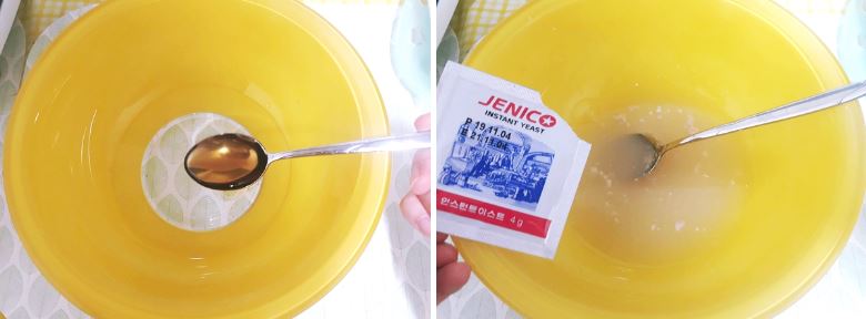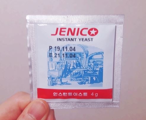 이스트는 생이스트/건조이스트/인스턴트이스트로 나뉘는데, 장기보관(1~2년) 가능하고 마트 등에서 쉽게 구입할 수 있는 것은 '인스턴트이스트'예요. 또한 인스턴트 이스트는 물에 풀지 않고 밀가루에 바로 섞어도 사용할 수 있는데, 저는 이스트의 발효(뽀글뽀글) 모습을 보고 싶어서 굳이 정석대로 진행했습니다.