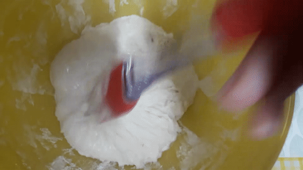 - 되직해지는 반죽 상태를 살피면서 밀가루를 추가하고, 가루가 날리지 않는 꾸덕한(!) 상태까지 만들어줍니다. 반죽이 뻑뻑해지면서 쉽지 않은데, 이때부턴 푹푹 찔러주는 느낌으로 섞어줘요.