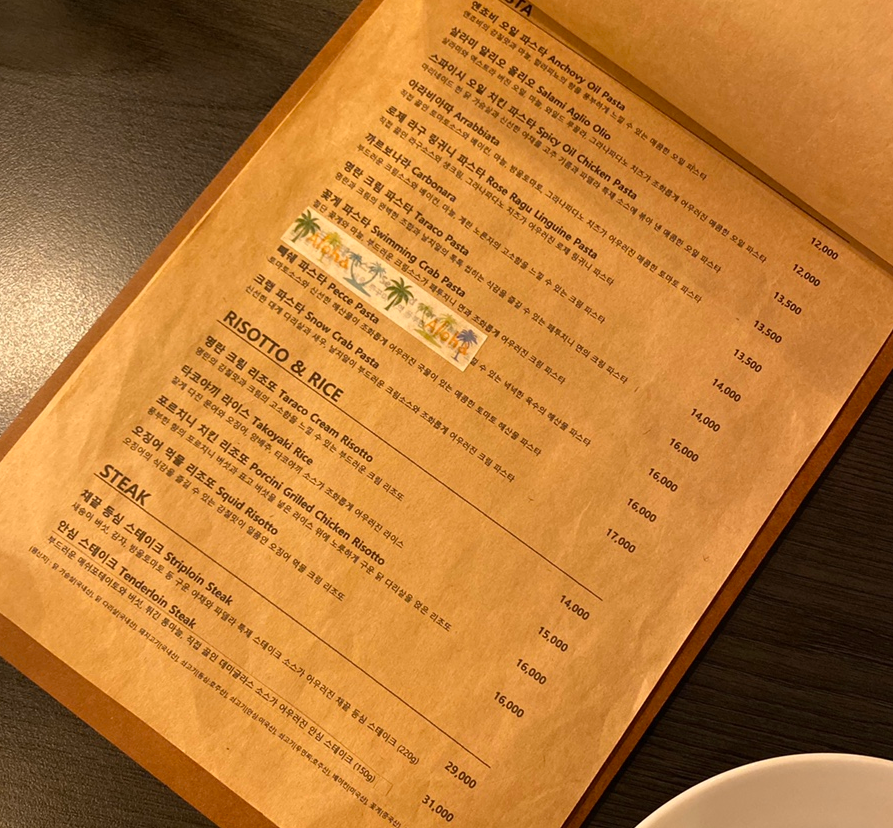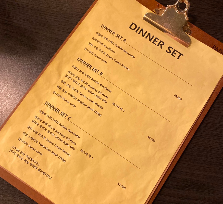 저녁시간에 방문하면 디너세트를 주문하는 것도 좋을 것 같고요, 파스타, 피자, 리조또, 그리고 스테이크 메뉴까지 다양하게 있으니 취향에 따라 선택할 수 있어요.