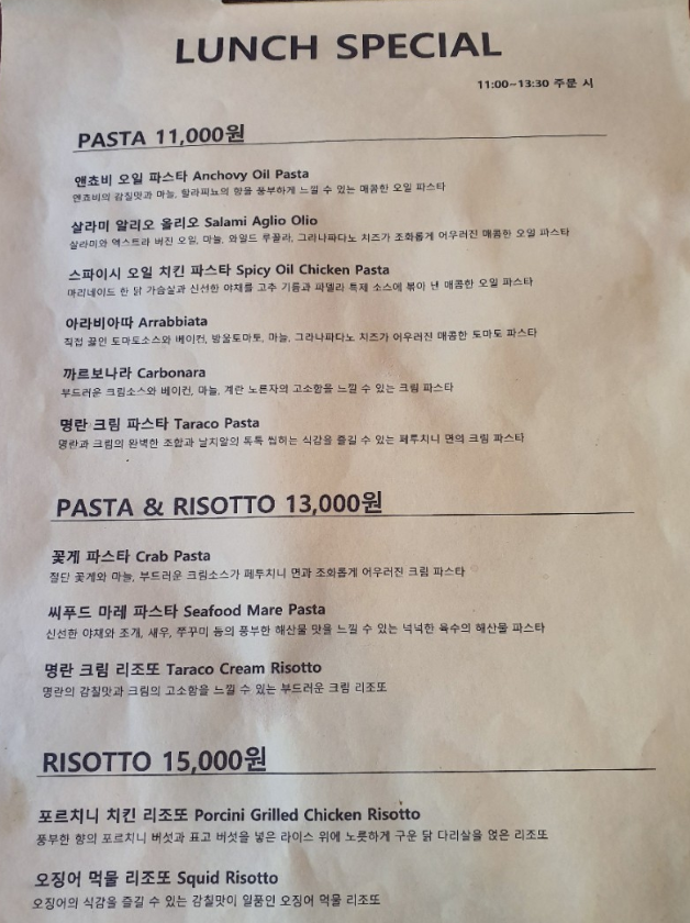파델라는 런치메뉴가 있어요. 11:00~13:30 주문 시 적용이 되는데요, 런치에만 되는 메뉴가 따로 있는 건 아니고, 기존 메뉴 중 일부를 조금 저렴하게 주문할 수 있어요. 파스타 류, 리조또 류가 있는데요, 지금까지 '이건 실패다'하는 메뉴는 없었어요. 뭘 주문해도 기대 이상이었습니다.