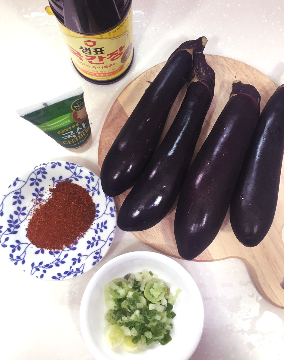 가지 4개 (하나는 구워서 따로 할 거예요), 파, 마늘(한스푼), 국간장, 고추가루 그리고 설탕(반스푼 또는 한스푼), 참기름. 재료도 간단하죠?
