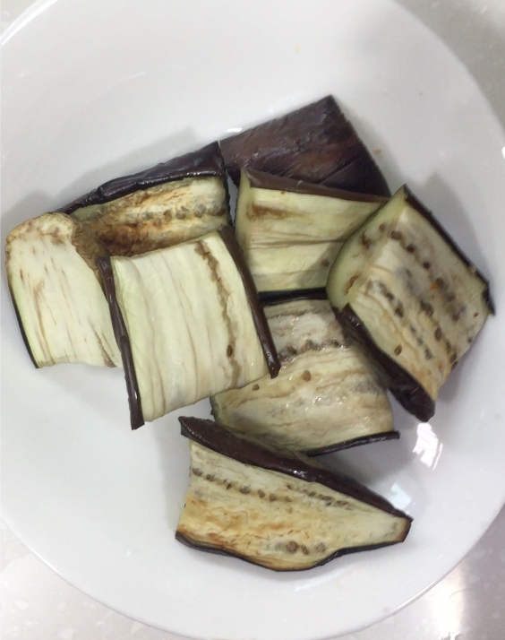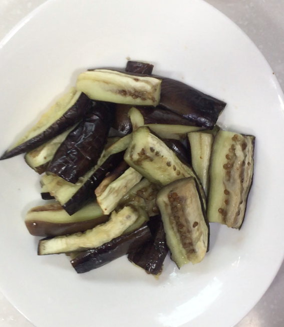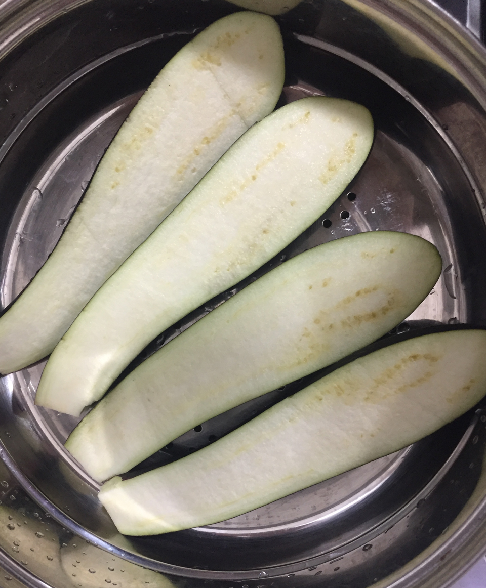 잘 씻어서 꼭지부분을 떼어낸 - 잘라낸 가지는 반으로 갈라서 찜기에 5분 정도 쪄줍니다. 젓가락이 쑥 들어갈 정도로 찌면 되는데, 약간 덜쪄도 괜찮아요. 다만 가지는 꼭 이렇게 익혀서 먹어야 합니다. 익히지 않으면 솔라닌이라는 독성(감자싹에 있는 독과 같은) 때문에 복통, 구토, 설사를 일으킬 수 있다고 해요. 옛날엔 먹을 것이 귀하고 간식이 없을 때 밭에서 가지를 따서 바로 와구 먹었다는데, 괜찮았는지 아니면 배가 아팠는데 그런 얘긴 없는 것인지 모르겠어요. 아무튼 익혀 먹어야 합니다.