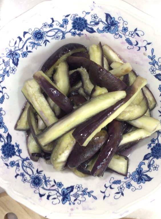 잘 씻어서 꼭지부분을 떼어낸 - 잘라낸 가지는 반으로 갈라서 찜기에 5분 정도 쪄줍니다. 젓가락이 쑥 들어갈 정도로 찌면 되는데, 약간 덜쪄도 괜찮아요. 다만 가지는 꼭 이렇게 익혀서 먹어야 합니다. 익히지 않으면 솔라닌이라는 독성(감자싹에 있는 독과 같은) 때문에 복통, 구토, 설사를 일으킬 수 있다고 해요. 옛날엔 먹을 것이 귀하고 간식이 없을 때 밭에서 가지를 따서 바로 와구 먹었다는데, 괜찮았는지 아니면 배가 아팠는데 그런 얘긴 없는 것인지 모르겠어요. 아무튼 익혀 먹어야 합니다.