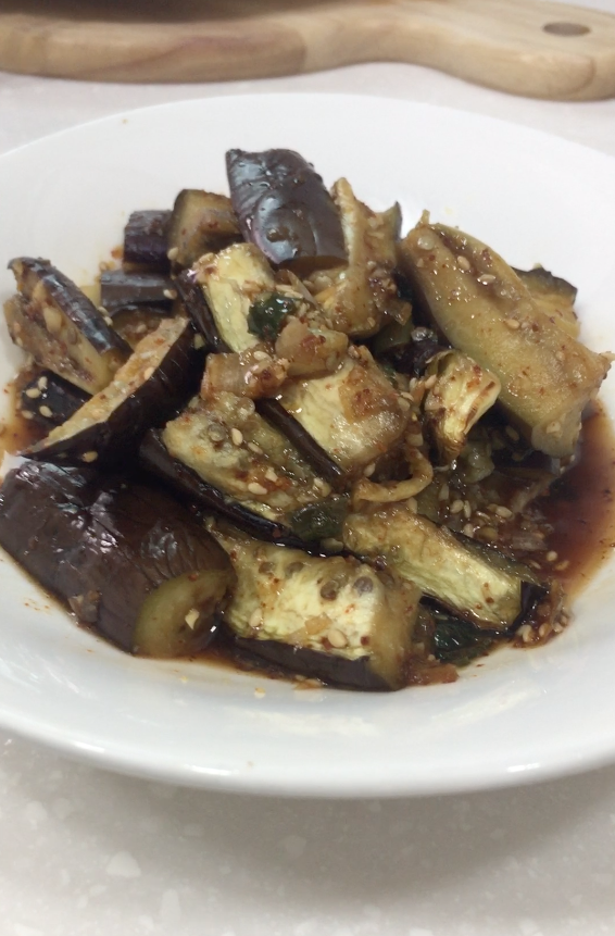 그리고 남겨둔 양념으로 무쳐주면 끝. 가지는 물이 많은 채소라 구워냈는데도 벌써 살짝 물이 생겼네요.