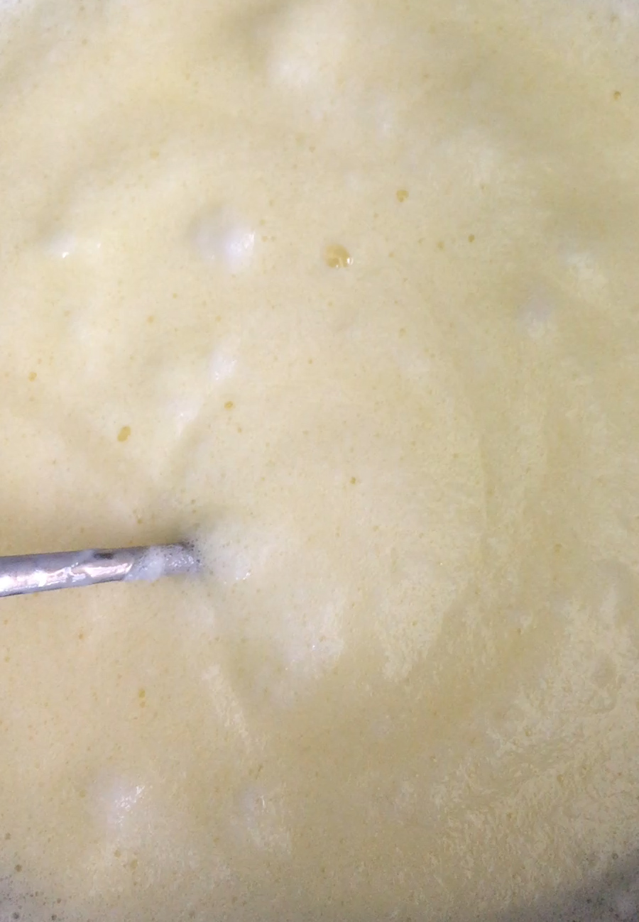 그리고 버터는 전자렌지에 살짝 돌리거나 중탕으로 녹여서 준비하구요. 노른자 힌자를 섞고 핫케이크 가루와 버터 녹인 것을 같이 섞어 줍니다. 우유도 이 때 같이 넣어주면 되는데요. 우유는 농도를 봐가면서 섞어주세요. 농도가 막 주루룩 흐르면 제대로 부풀어오르지 못할 거구요. 반죽이 너무 단단해도 그럴 거예요. 저는 숟가락으로 떠 올려서 쏟으면 천천히 떨어지는 정도로 했습니다. 흐르긴 하지만 많이 된 상태예요. 요것보다 아주 조금 더 묽어도 될 거 같은데, 건드리면 망할까봐 여기서 멈췄어요.^^
