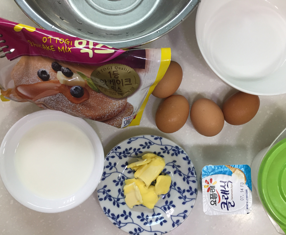 핫케이크가루는 지난 번에 300g 정도 남겨두었기 때문에 남은 가루를 이용했구요. 그래서 재료는 대충 핫케이크가루, 설탕, 버터, 계란 4개, 우유, 플레인 요거트입니다. 설탕은 처음에 준비는 해두었는데, 넣지 않았어요. 핫케이크가루가 이미 설탕이 충분이 들어가 있을 거라 생각해서 뺐습니다. 넣좀 더 달달한 카스테라를 원하시면(시중에서 파는 정도) 설탕을 한스푼 정도 추가해주세요. 대신 저는 플레인요거트를 추가했어요.