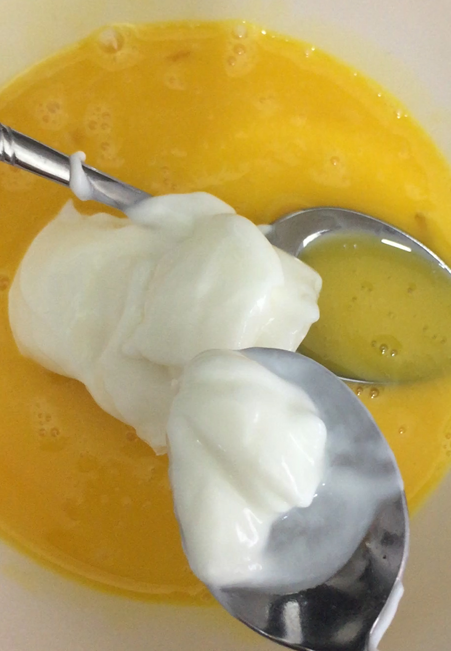 휘핑상태는 들어 올렸을 때 뿔이 생겼다가 구부러지는 정도면 된다고 해요. 여기에 저어둔 노른자를 섞을 건데요. 그 전에 노른자에 요거트를 먼저 섞었습니다.