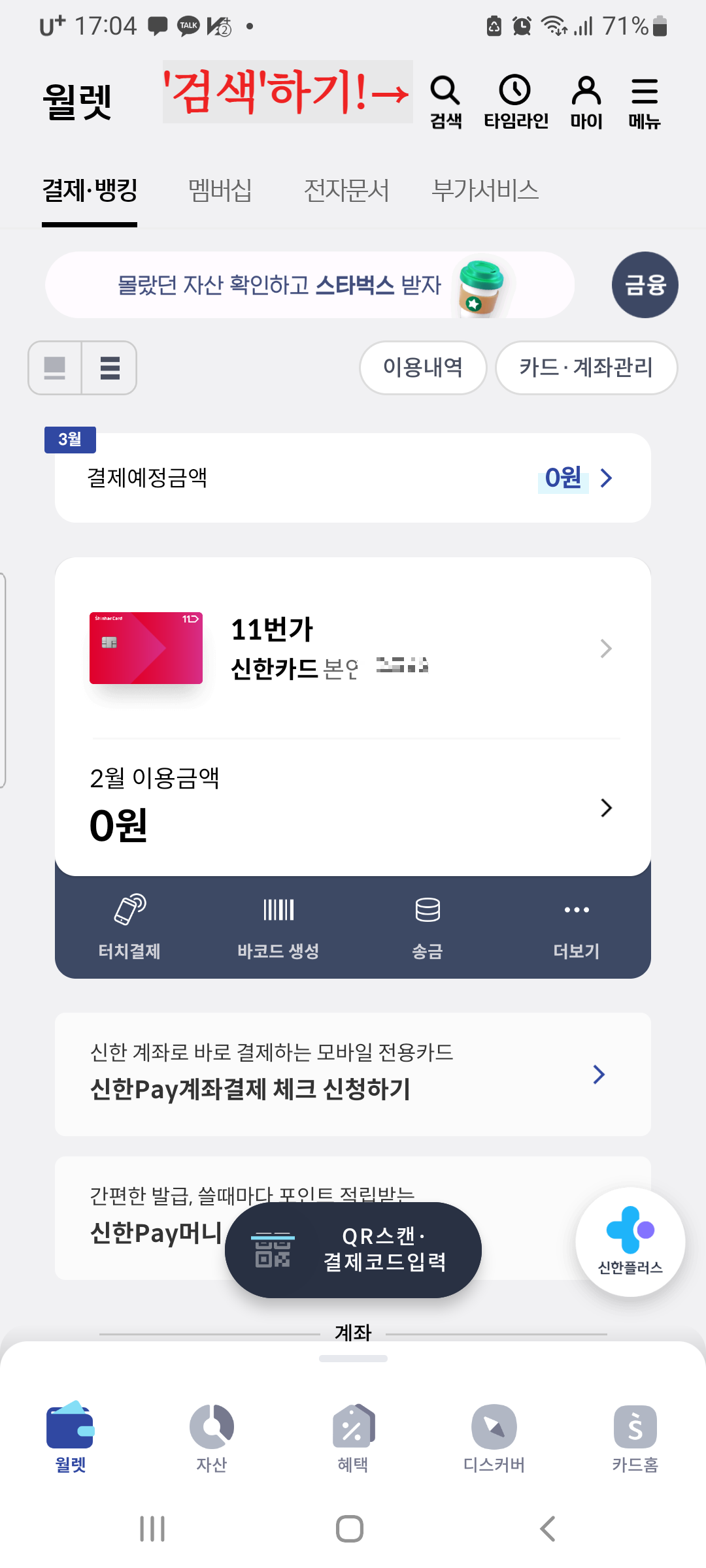 그런데 위 내용과 고객센터 전화번호 안내만 있을 뿐이라서.. 이번엔 앱으로 다시 방법을 찾아보았습니다. 신한플레이 앱을 실행하고 로그인후, 마이페이지로 들어가도 해지 메뉴가 보이지 않길래, 바로 '검색'으로 '해지'키워드를 넣어봅니다.